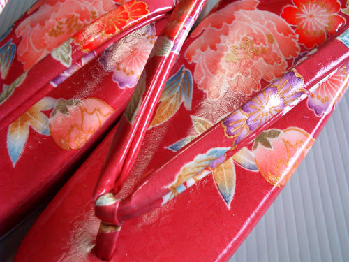 コメント:訪問着のあまり布で作った草履です。ビニールコーティングを施して強度と防水性を高めました。サイズ・ヒール高などお気軽にご相談ください。